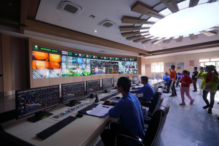 在园区的中央控制室,大屏幕上实时显示着炉渣处理、烟气净化等垃圾处理的各道工序画面,相关运行数据实时更新。操控台前,几名技术人员正紧盯屏幕,远程操控和监测各道工序流程,这里始终保持着24小时运转状态。